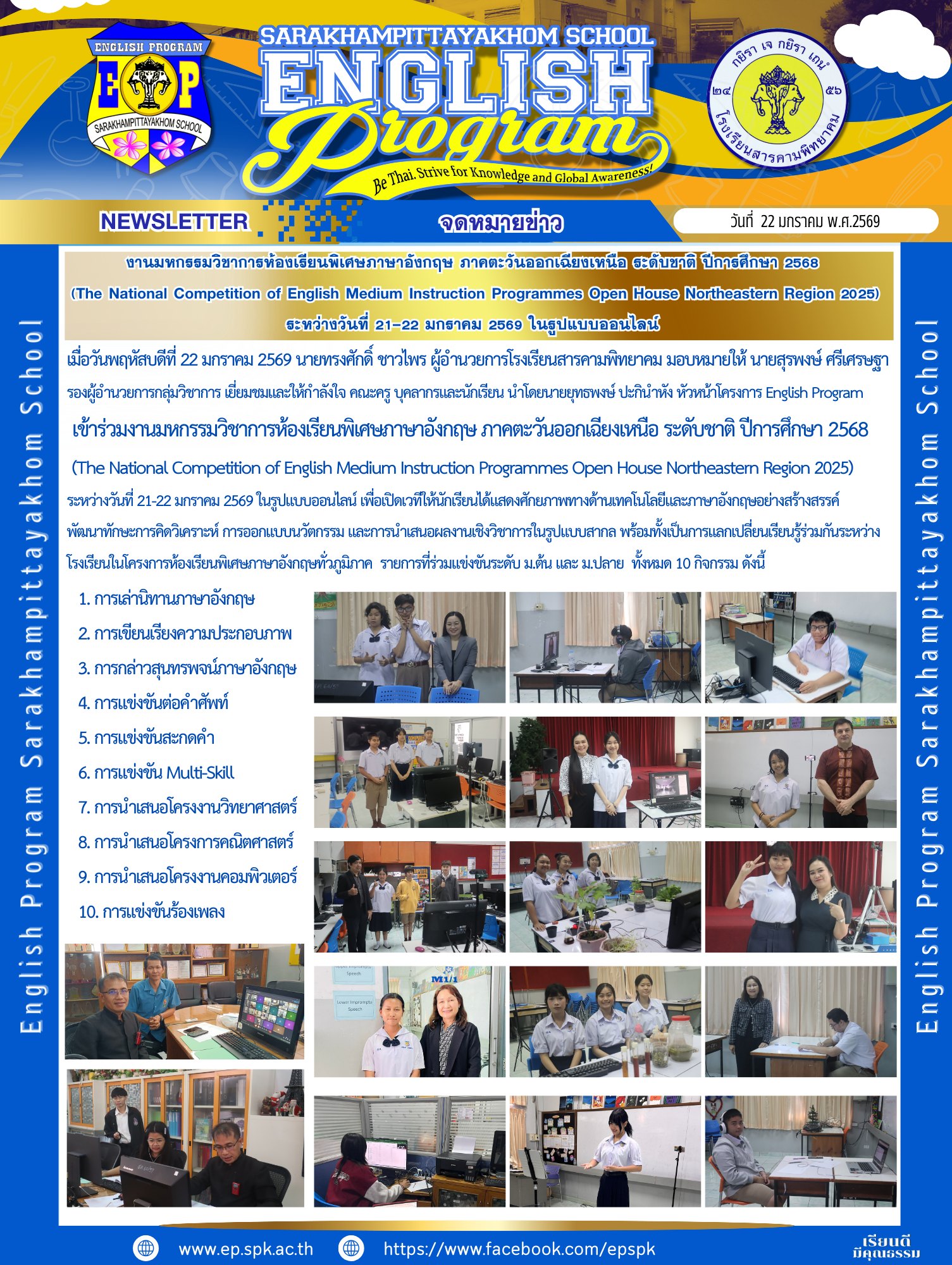 The English Program (EP) at Sarakhampittayakhom School is pleased to share the highlights of its participation in “The National Competition of English Medium Instruction Programmes Open House Northeastern Region 2025”. This significant academic event took place on January 21-22, 2026, via an online platform.